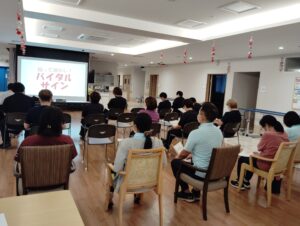 今回の勉強会は『バイタル測定について』訪問看護ステーションの看護師さんによる、日ごろの健康管理や、体調が急に変わったときの気づき方について教えていただきました。